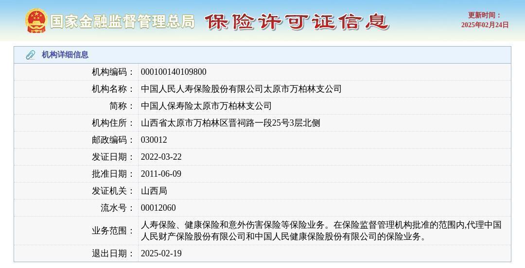 2月25日,根据国家金融监管总局保险许可证信息,中国人民人寿保险股份有限公司太原市万柏林支公司获准退出,退出日期2025年2月19日。